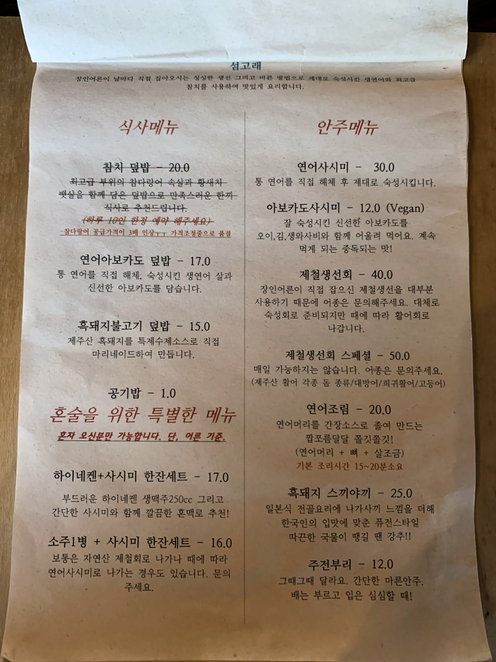 무엇보다 인상 깊었던 점은 오픈 시간 10분 전인데도 이미 저 말고 다른 혼술 손님이 자리를 잡고 있었다는 것입니다. 눈치 보지 않고 혼자만의 시간을 온전히 즐길 수 있는 분위기, 그리고 그것을 당연하게 받아들여 주는 사장님의 묵묵한 배려가 섬고래를 다시 찾고 싶게 만드는 진짜 이유였습니다.
