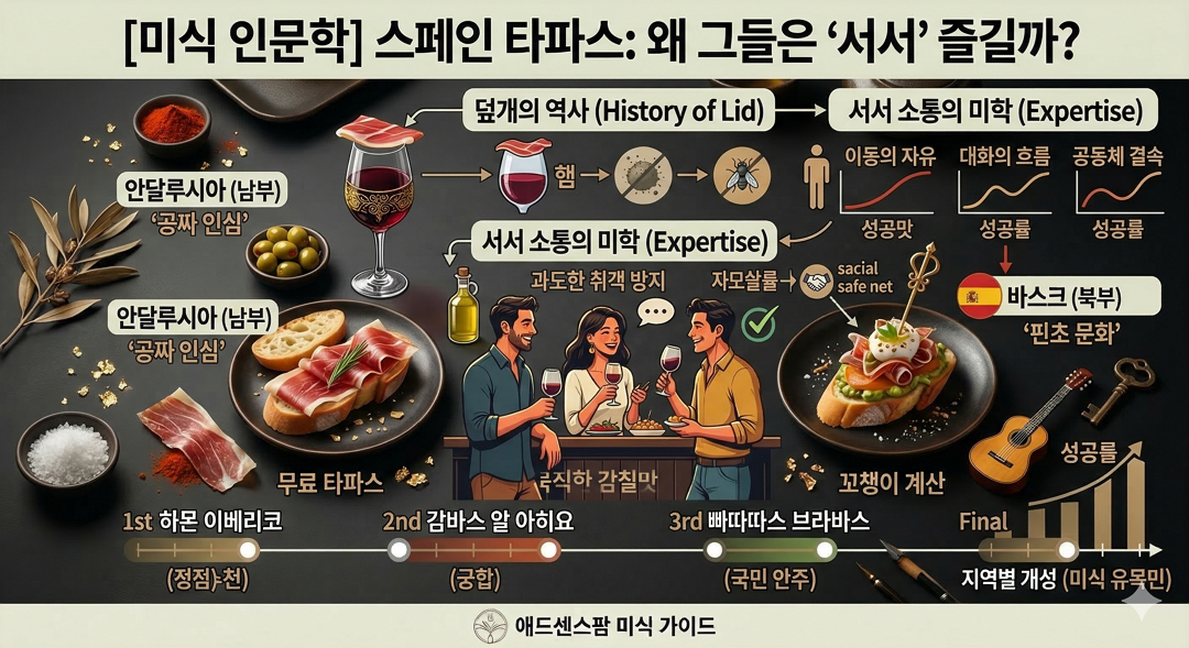 - 정보성 가치: 이처럼 타파스는 단순히 맛을 위해 태어난 것이 아니라, **'술의 품질을 지키고 건강한 음주 문화를 유지하려는 실용적인 목적'**에서 시작되었습니다.