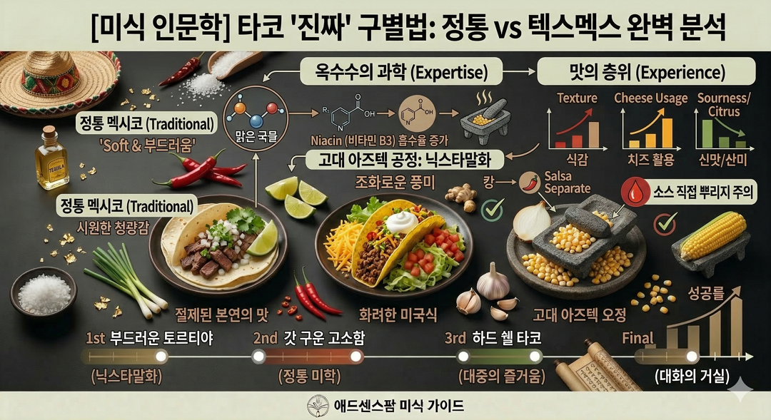 "이 집 타코 잘하네"라고 판단하는 기준은 화려한 토핑이 아니라, **"토르티야가 얼마나 구수한가"**와 **"살사가 고기의 기름기를 얼마나 우아하게 잡아주는가"**에 있습니다.