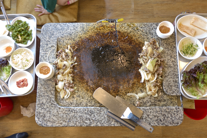 맛에 대해서는 가족 내에서도 의견이 갈렸습니다. 신선한 재료 덕분에 담백하다는 평과, 기름기가 너무 빠져 퍽퍽하다는 평이 공존했죠. 돌판 구이 특성상 수분이 빨리 날아가기 때문에 발생하는 현상입니다.
